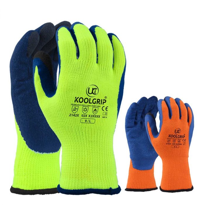 Thick thermal brushed polyester liner with excellent insulating capacities to keep hands warm in cold environments. High visibility yellow or orange liners for easy recognition and use in dim lighting applications where being seen is imperative. Contact Cold Level 1. Premium crinkle latex coating for enhanced grip and abrasion resistance.