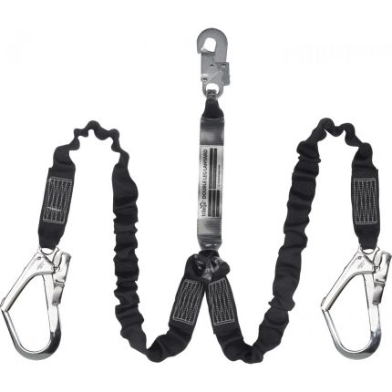 Single leg webbing lanyard with shock absorber, carabiner and scaffold hook
